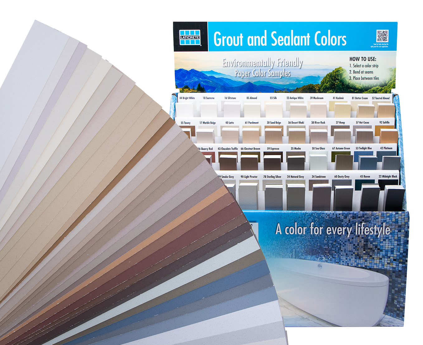 La herramienta Eco Grout Color Selector ofrece los 40 colores estándar e incluye canales de papel depositados en color de 8". Con perforaciones, se pueden plegar y adaptar fácilmente para adaptarse a los tamaños de juntas de lechada más comunes y también son ideales para paquetes de presentación, paneles de inspiración y más.